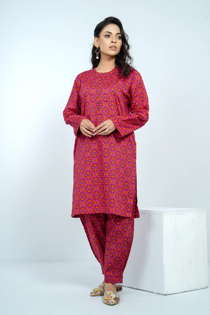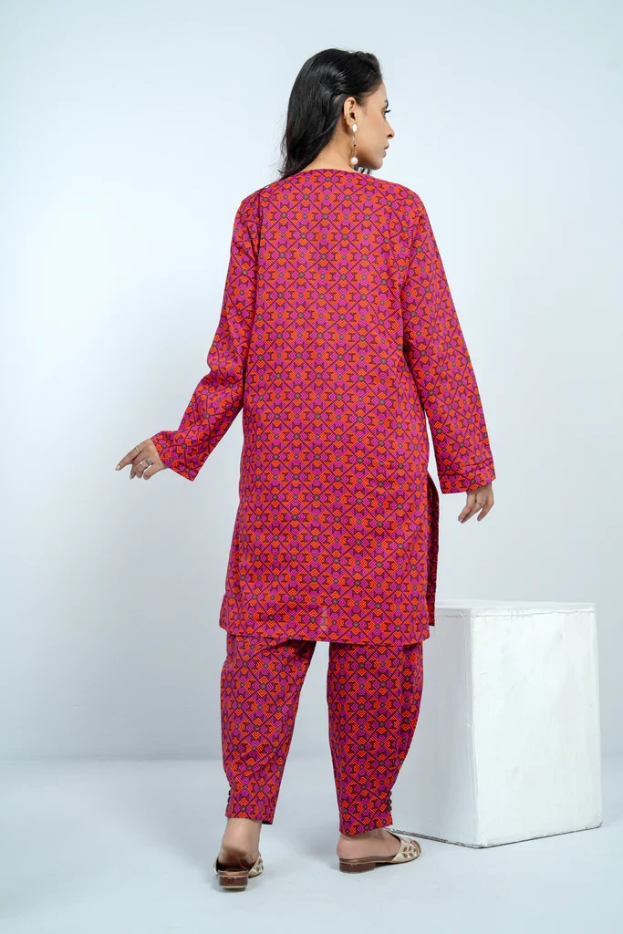 A reactive printed 2 pcs set embellished with round neck, piping, and wooden button which offers the perfect balance of comfort and style. It comes with a trousers embellished with an inverted pleat, wooden button, and pocket detailing.