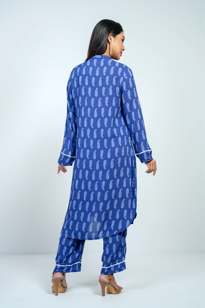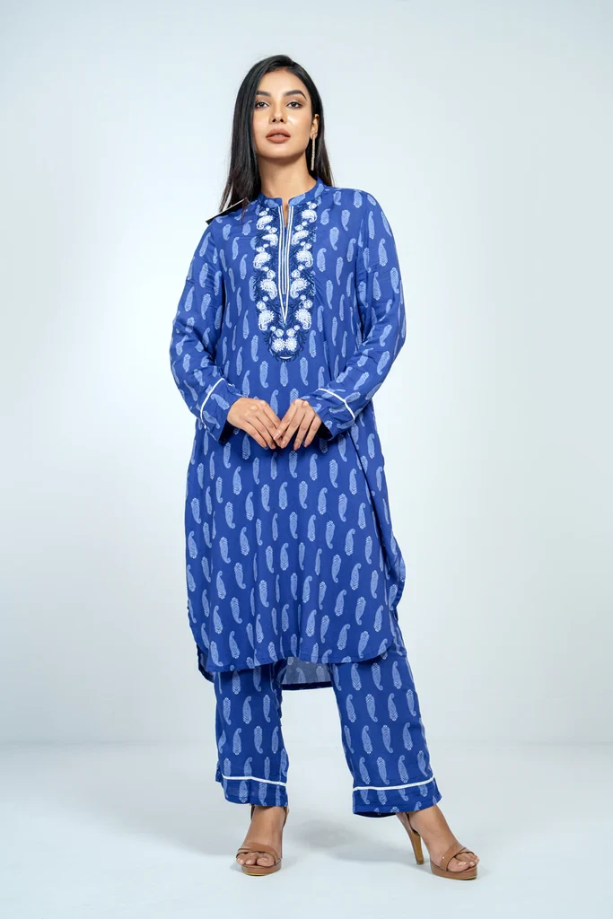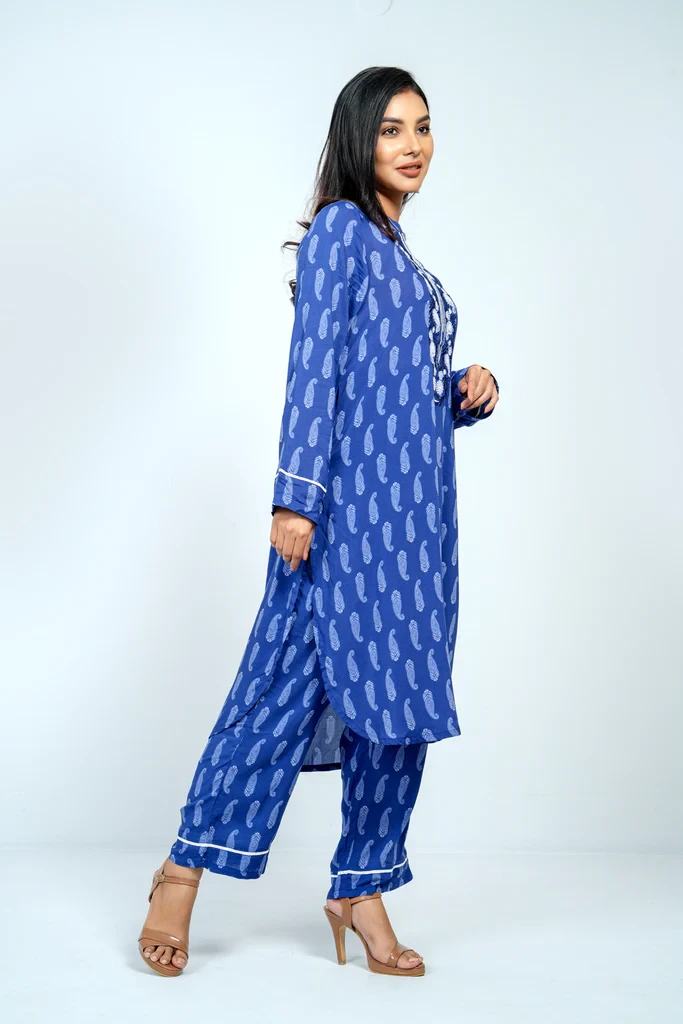 A reactive printed 2 pcs set embellished with embroidered and lace,which offers the perfect balance of comfort and style.