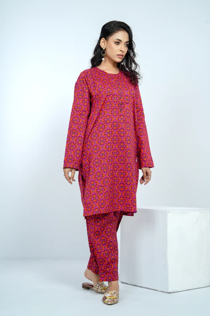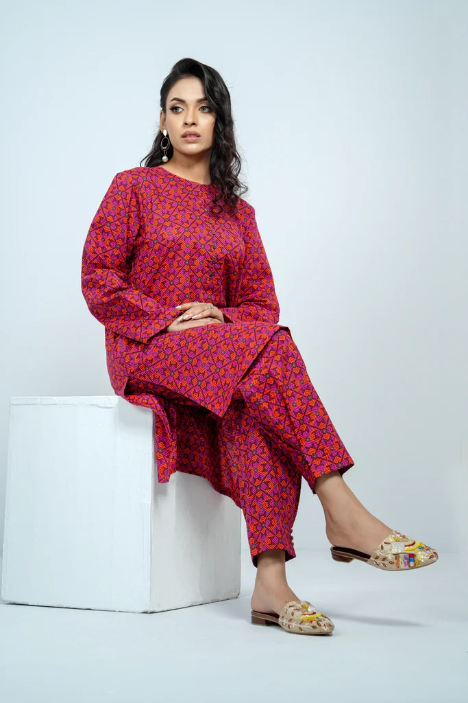 A reactive printed 2 pcs set embellished with round neck, piping, and wooden button which offers the perfect balance of comfort and style. It comes with a trousers embellished with an inverted pleat, wooden button, and pocket detailing.