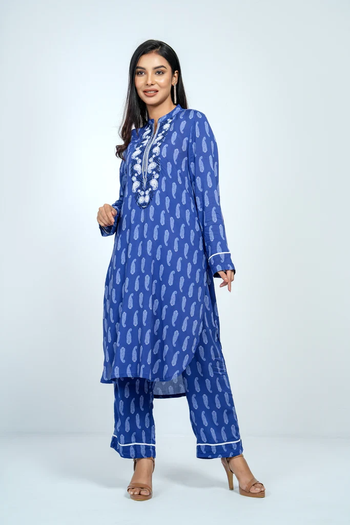 A reactive printed 2 pcs set embellished with embroidered and lace,which offers the perfect balance of comfort and style.