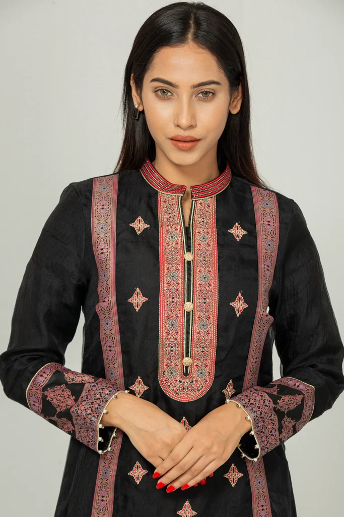 6.Fit: Regular fit kameez with printed patch and cut & sew detailing.
